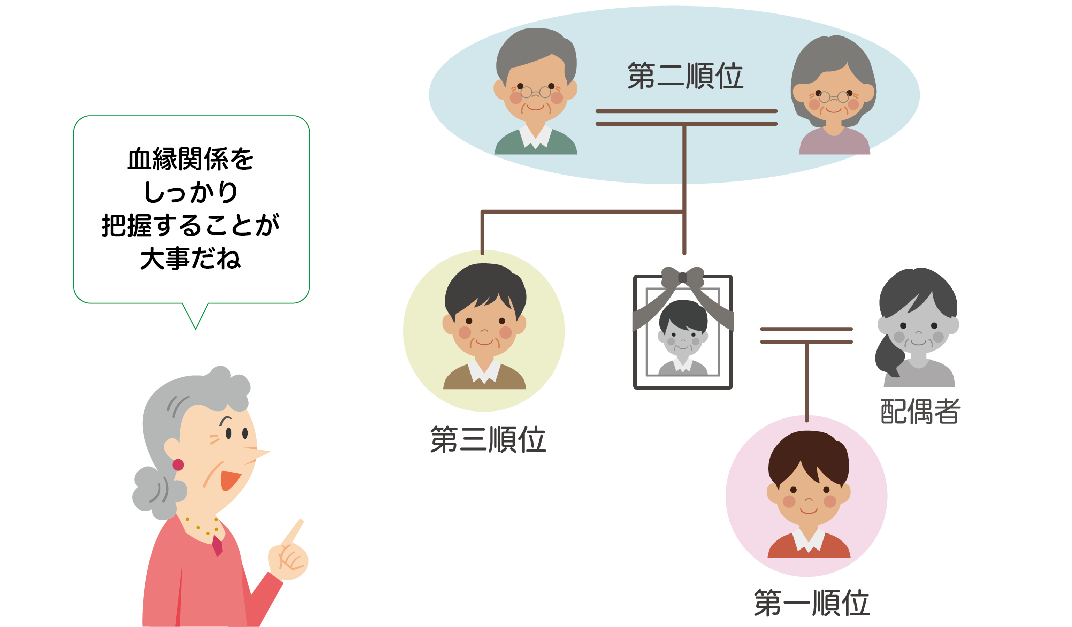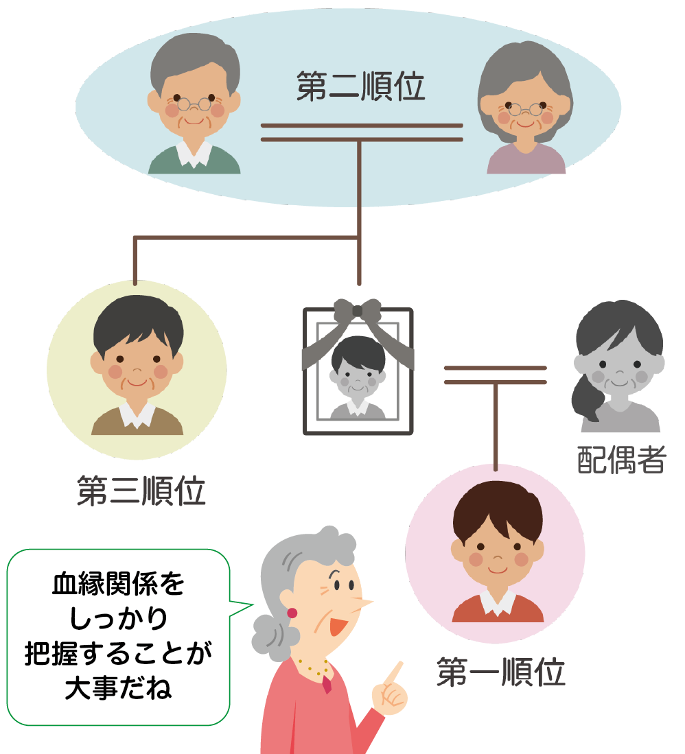 法律で相続する権利が定められている人のことを「法定相続人」といいます。配偶者は常に相続人となり、子が第一順位、子がいない場合は親が第二順位、親もいない場合は兄弟姉妹が第三順位となります。上位の人がいる場合、下位の人は相続人になりません。