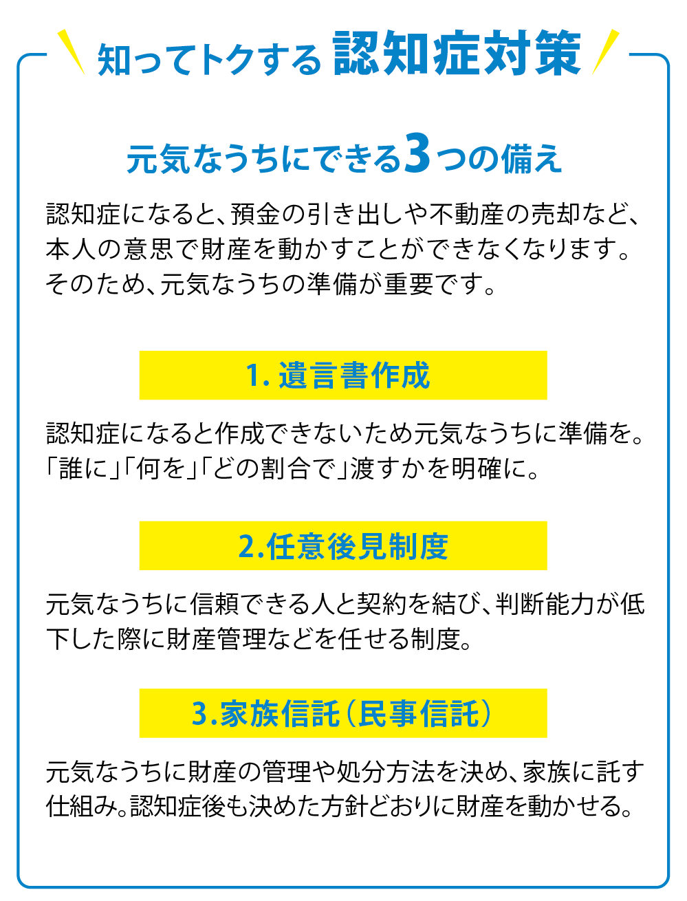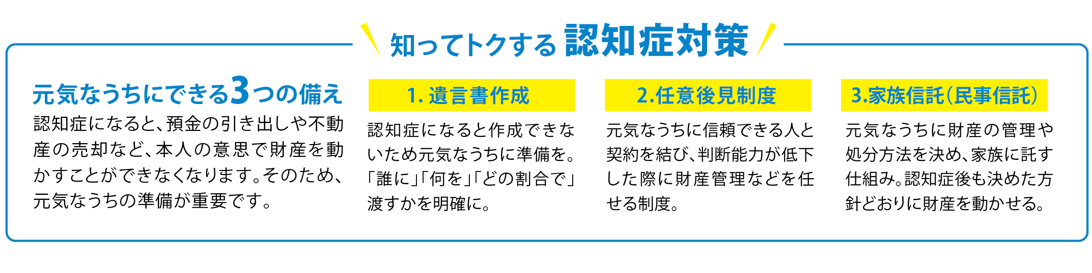 そのうえで、必要に応じて遺言書を作成し、認知症への備えとして任意後見や家族信託といった制度を検討することも選択肢
