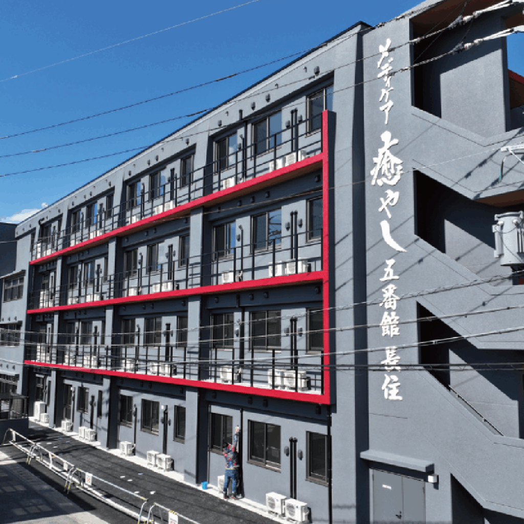 「メディケア癒やし」は、看護師の視点を生かして創設された有料老人ホームグループ。その五番館が、2025年4月に新たにオープンしました。医療的処置が必要な方や、重度要介護の方など、受け入れが難しいとされる方も、ここでは手厚いケアを受けながら安心して暮らすことができます。定期巡回・随時対応型訪問介護看護の制度で、24時間体制でサポートを受けられるほか、医療機関による往診や訪問リハビリの利用も可能。医療・看護・介護・リハビリが連携し、個々の状態に合わせた多様な支援を行っています。