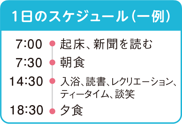 大好きな探偵ものや歴史小説など、ホーム内の図書室にたくさんの本が揃っているので飽きることがありません。「食事は栄養バランスが良く、毎日メニューが変わるので今日は何かな?とわくわくします。